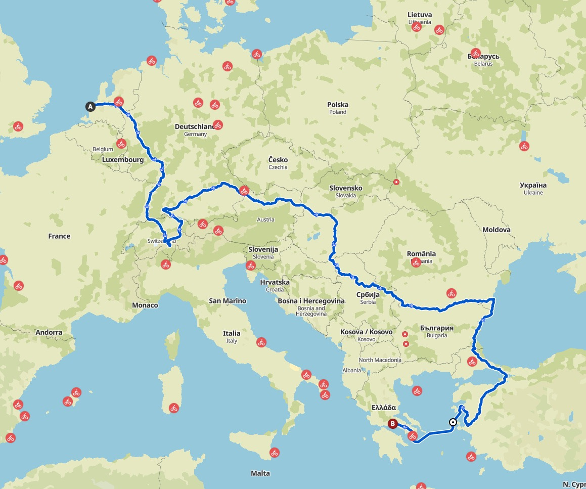 2022年5月初,横跨美国的骑行结束时,队友问起下面的计划,我说想去骑欧洲。经过两个多月筹划,7月下旬终于成行。这次横跨欧洲大陆的骑行路线大致包括“两河两海”:莱茵河-多瑙河-黑海-爱琴海。从大西洋岸边的“荷兰之角”(Hoek van Holland)出发,沿莱茵河溯流而上,经过德国、法国、瑞士,到阿尔比斯山;再北上进入德国黑森林一带,沿多瑙河往下游骑,经过奥地利、斯洛伐克、匈牙利、克罗地亚、塞尔维亚、罗马尼亚,直到黑海;再南下经保加利亚到土耳其,从伊斯坦布尔进入亚洲,沿爱琴海东岸向南到伊兹米尔,最后乘船到希腊雅典。