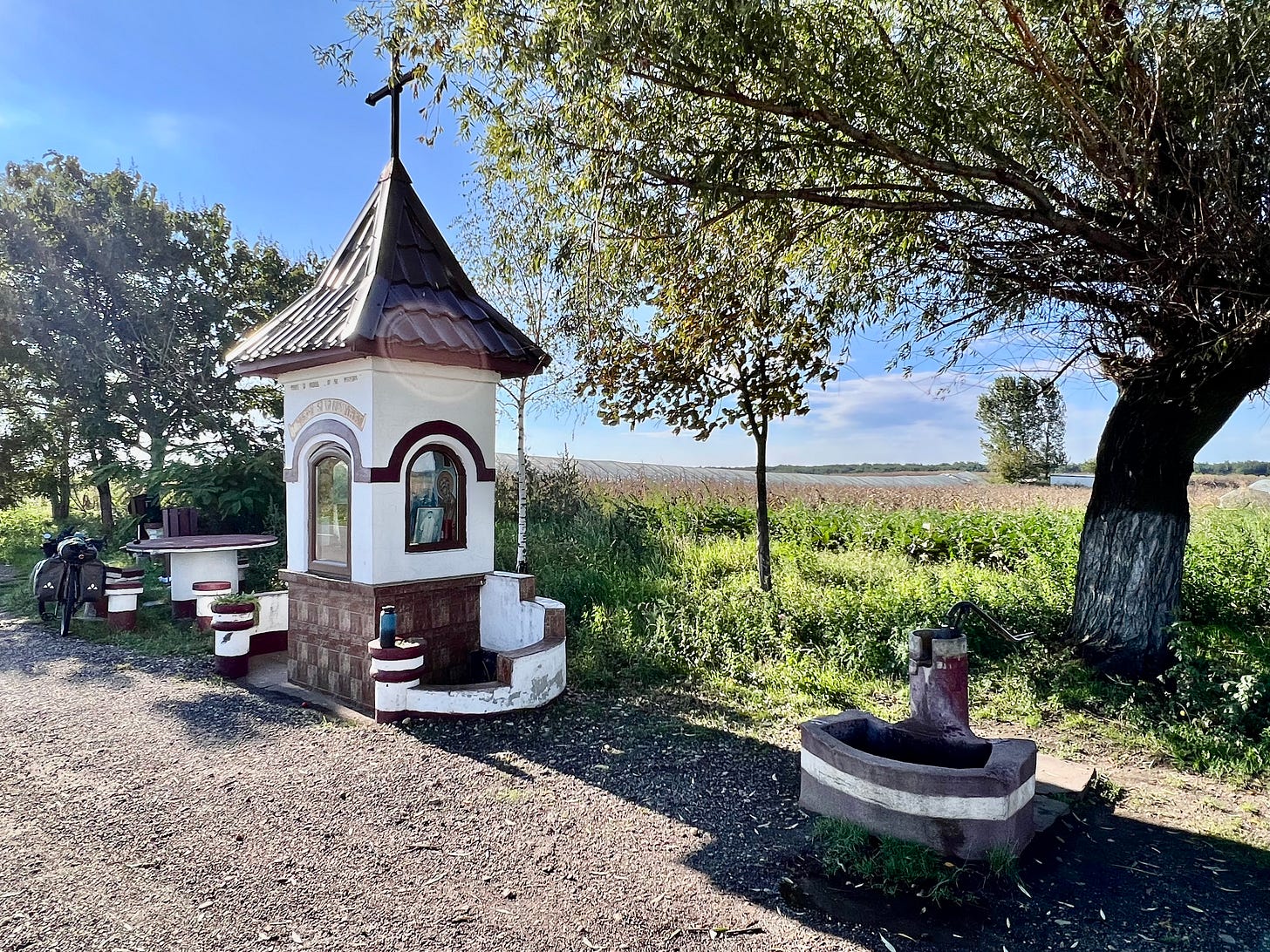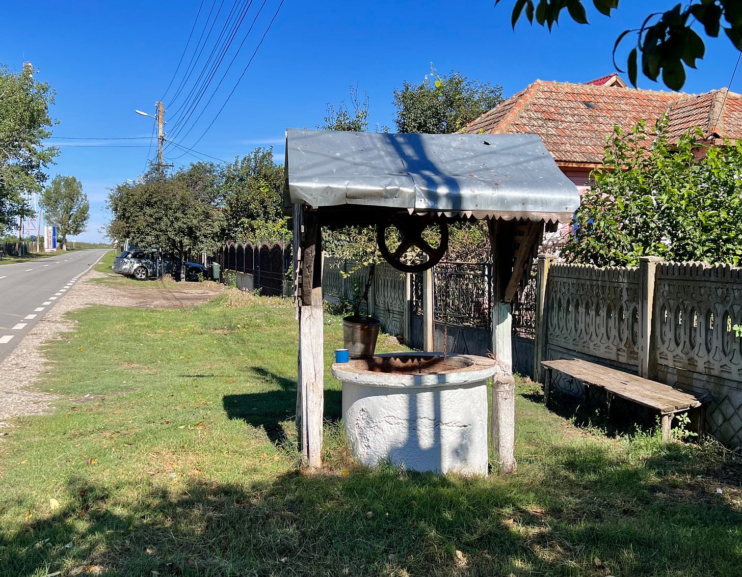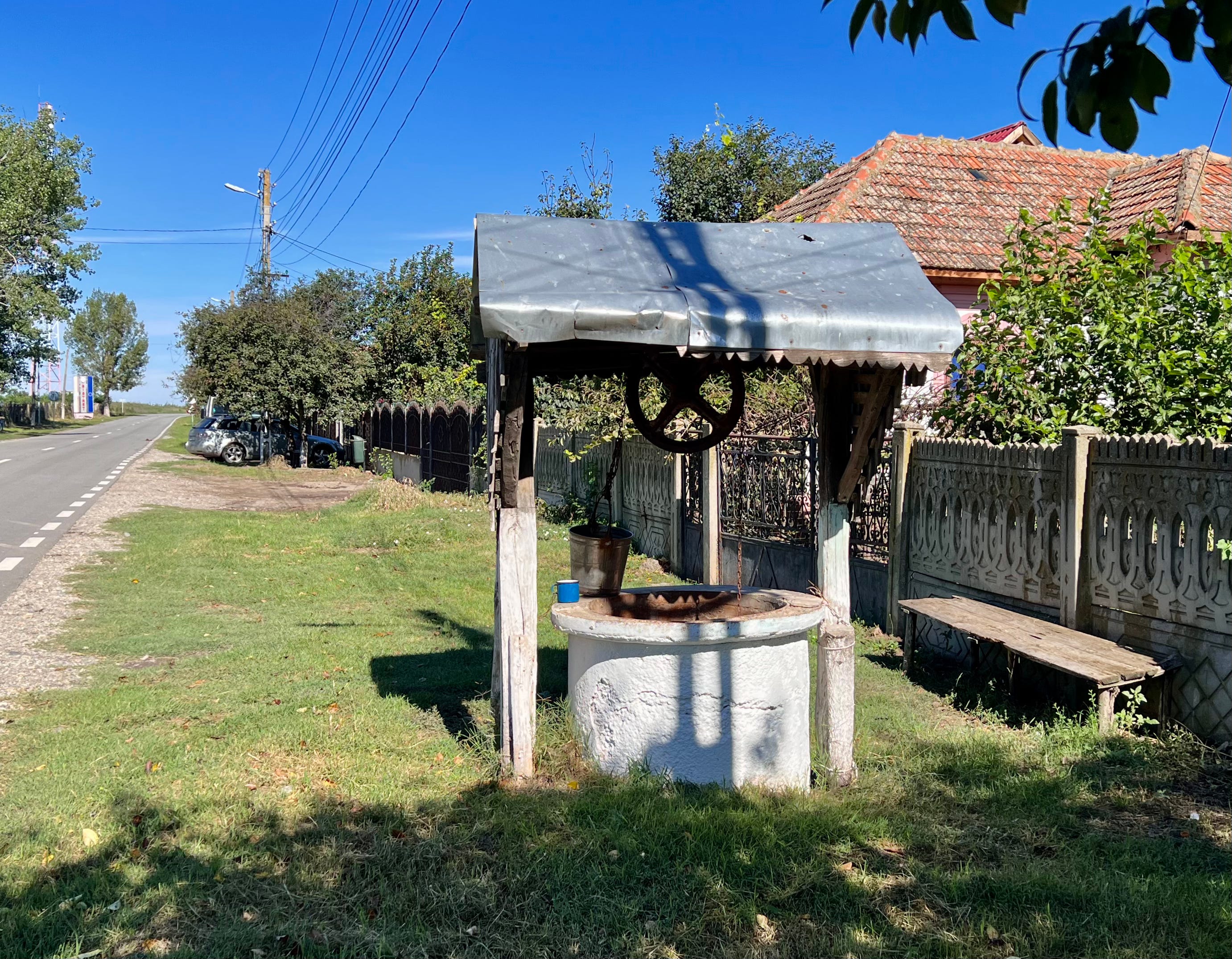 进入罗马尼亚的第二天是中秋节,我一早出发,避开上班的车流,在乡村公路上继续沿多瑙河北岸往东骑。路过的每个村庄都有一座教堂,教堂旁边都有一处墓地,教堂的钟楼都是村里的最高建筑。每个村口的路边都立着统一设计的村名标志和欧盟标示,用罗马尼亚语写着“欢迎莅临”,村公所门口都挂着罗马尼亚国旗和欧盟旗。几乎每个村口都有一口水井,有的井台上放着水桶和一只缸子。那种涂着蓝色和白色油漆的缸子现在已经很少见了,放在那里显然是供路人喝水用。