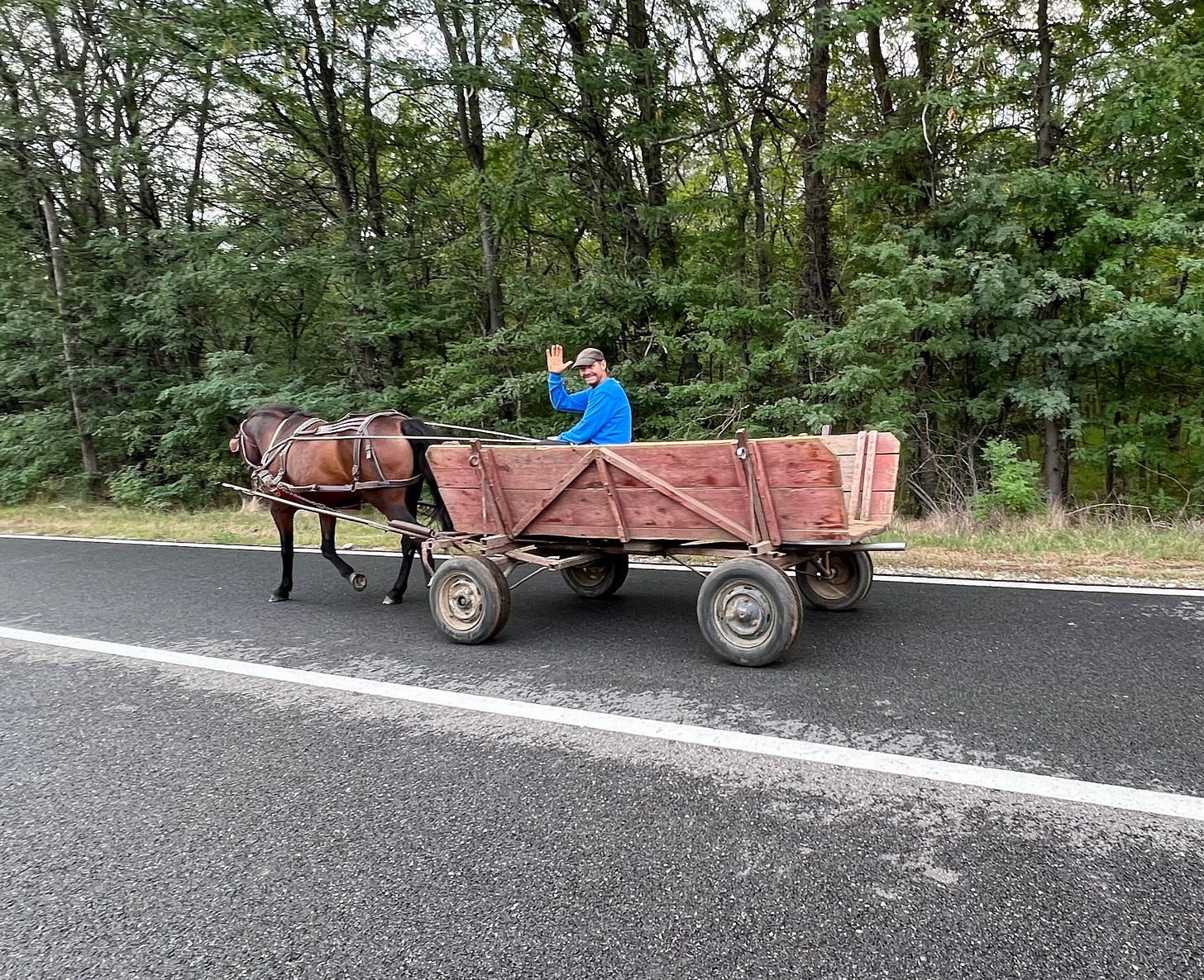有一天午后,骑到一个村口,一对衣着破旧的中年夫妇赶马车迎面过来,身边坐着五个孩子,一起冲我挥手欢呼。那都是此行最令人难忘的场景。罗马尼亚的农村生活并不富裕,我跟村民也语言不通,但随处能感受到男女老幼对陌生人的温情与善意。
