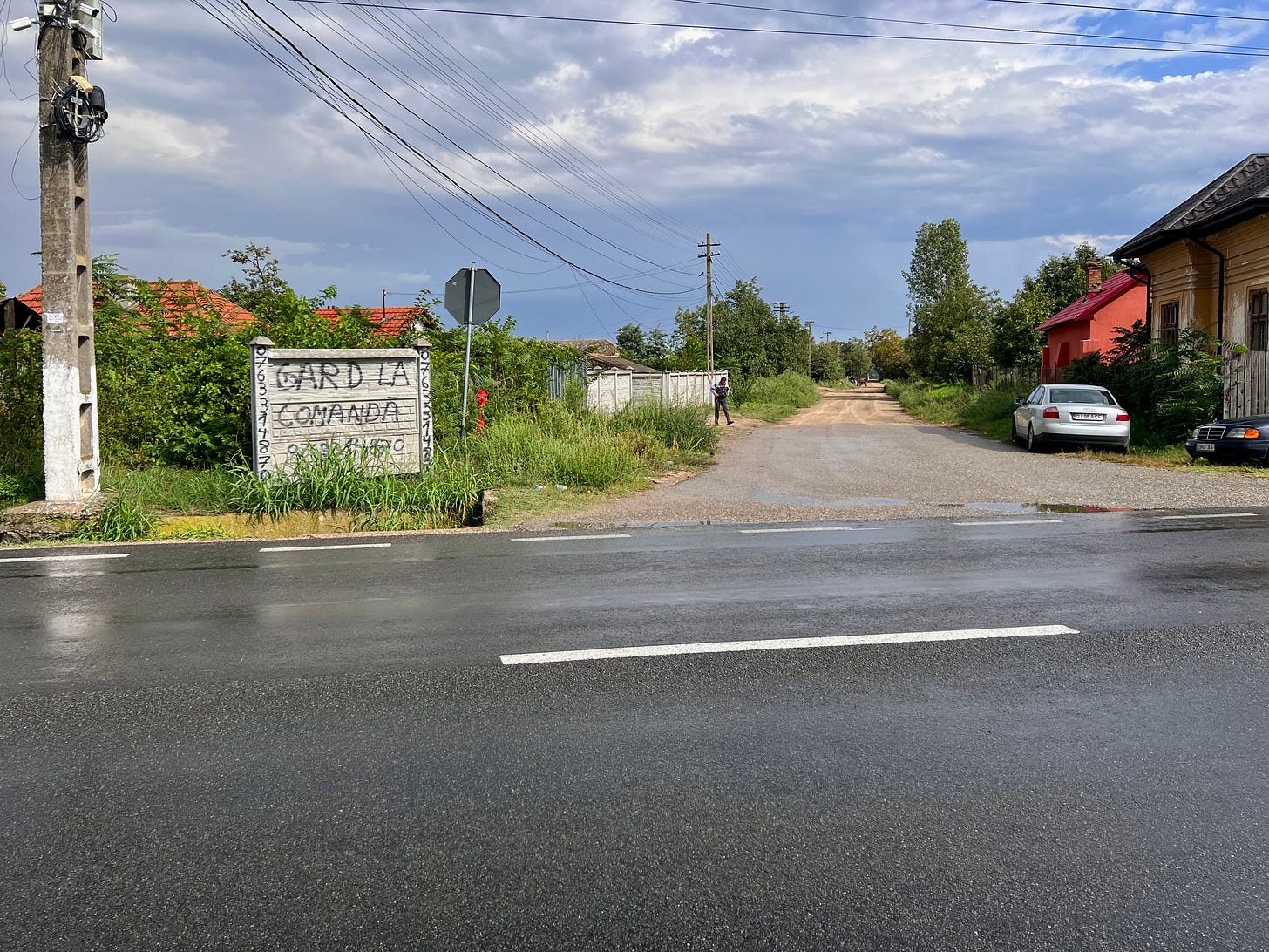 几条狗冲到离我们几步远的地方停住,只是狂叫,并不攻击。那位老人越走越近,丹妮拉能跟他搭上话了,两人隔着几条狂叫的狗相互用罗马尼亚语喊话。丹妮拉说,老人让她不用怕,这些狗只叫不咬人。我正在半信半疑,叫声嘎然而止,几条狗一起跑进了路边的树丛,消失得无影无踪。这一切发生得太快,丹妮拉对转瞬间化险为夷还没有反应过来,一脸诧异地问:“狗跑哪儿去了?”