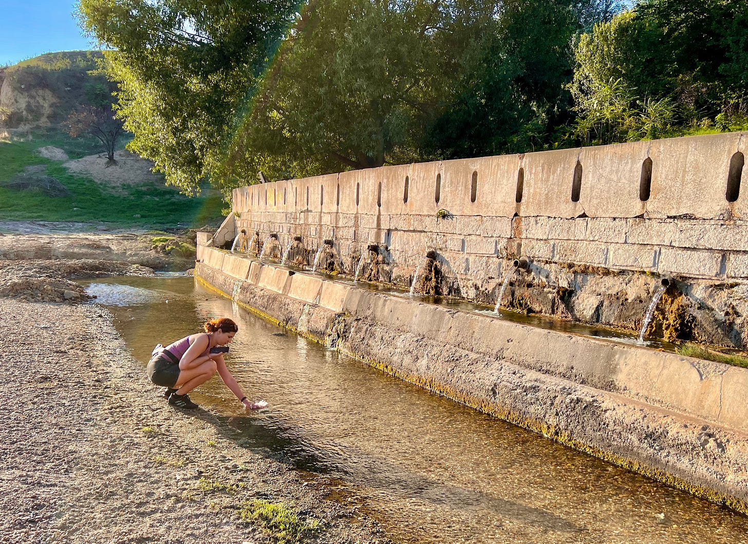 “雪绒花”客栈还住了一位开房车旅行的罗马尼亚姑娘。她自我介绍名叫丹妮拉,家住布加勒斯特,但母亲住在比利时的布鲁塞尔。丹妮拉说附近有处泉水,还有个大湖,我们约好骑车去湖上看日落。她借了加百列的山地车,比我的车子轮胎更适合走砂石路。