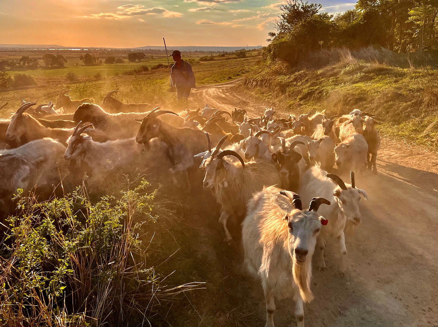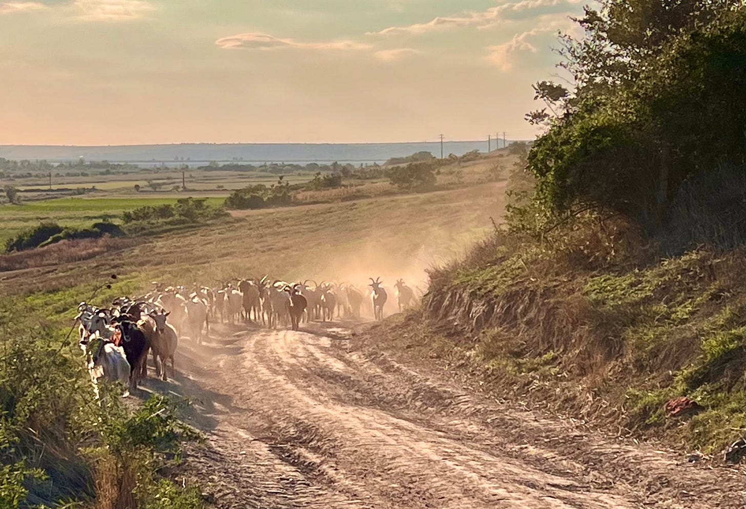 一路上坑坑洼洼,在一道山坡上,远远看到牧羊人赶着羊群,堵塞了道路。大群山羊踏起一片沙尘,由远及近移动过来。我们穿过羊群,快到大湖时,几条狗狂叫着从前面的路上跑过来。一位老人跟在后面冲狗喊话,但狗并不理会。我让丹妮拉从车上下来,把车挡在人和狗之间,顺手从路边捡了块石头,以防不测。