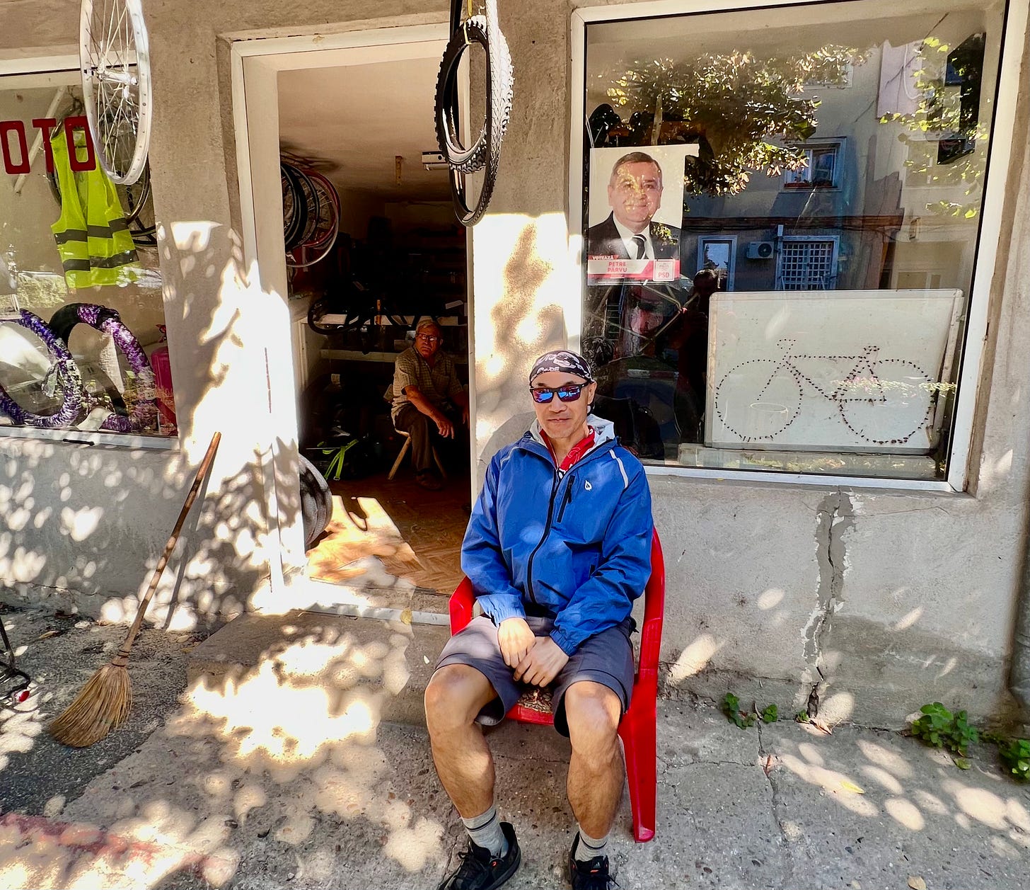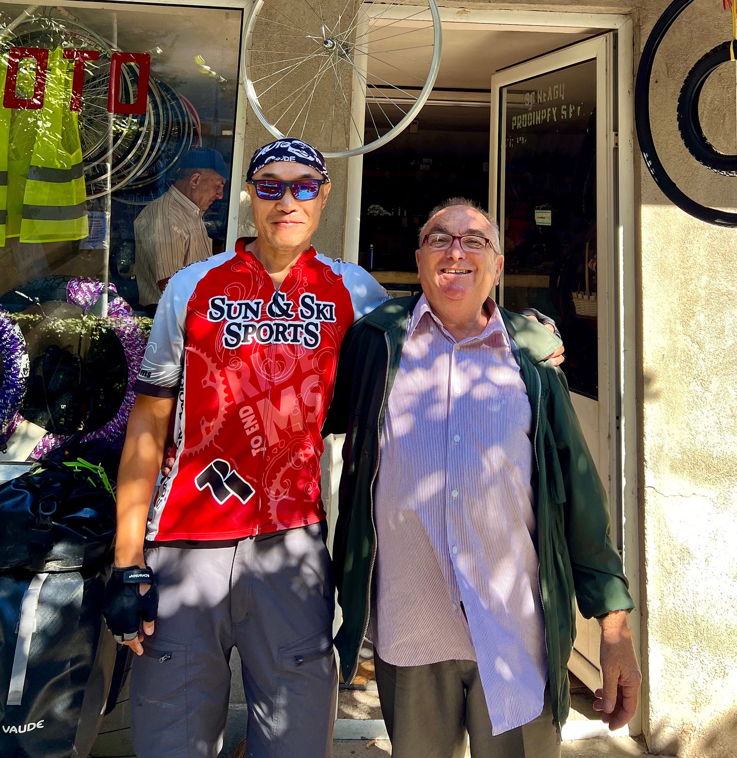 大约15公里后,我骑到镇上的车铺。修车的是位老大爷,只讲罗马尼亚语,他可能有口音,谷歌翻译不全。老人没有修过“速联”变速器的车,卸变速轮有点作难。他回家拿了一箱子工具,挨个试。两个小时后终于修好了,又调整了轮圈的辐条。