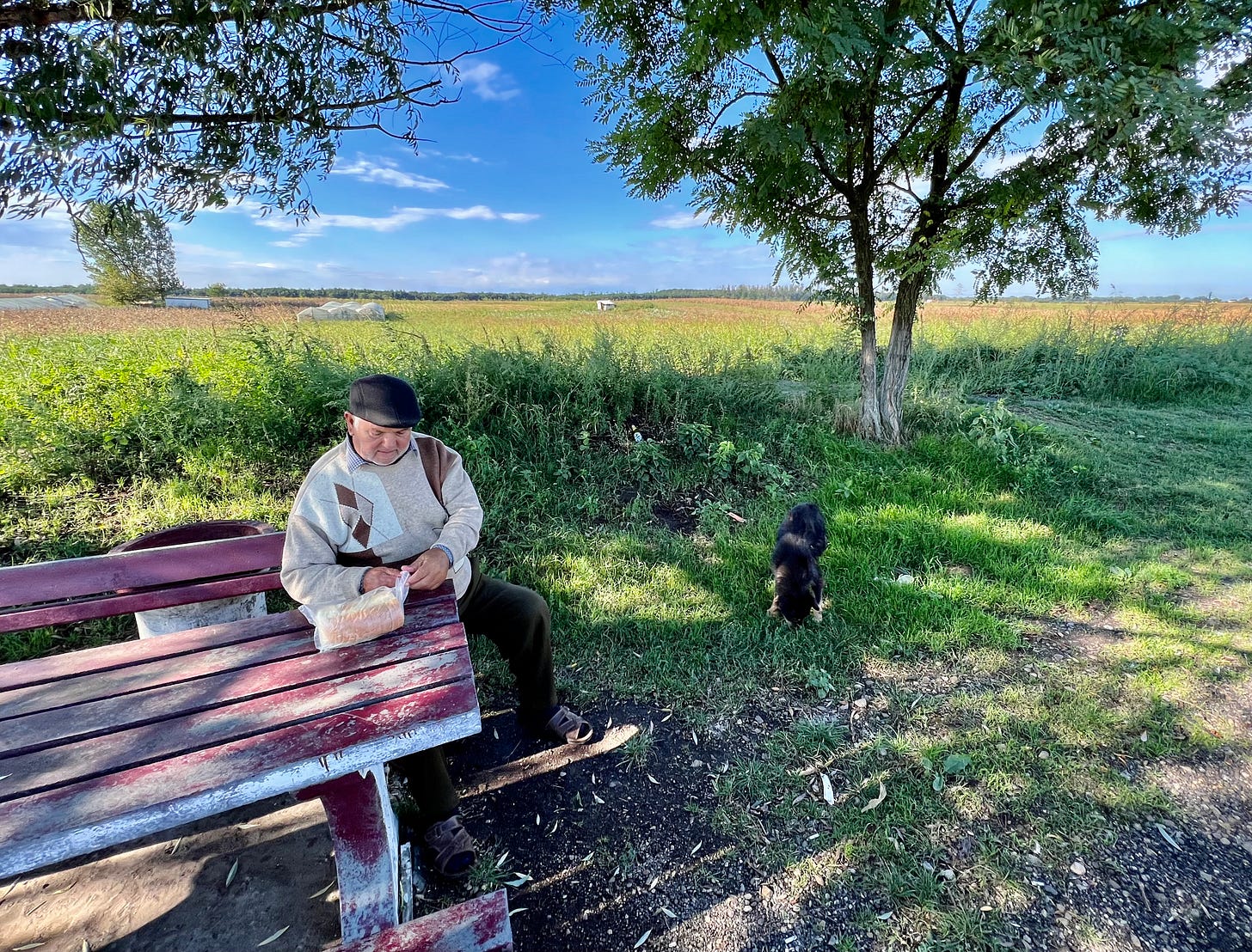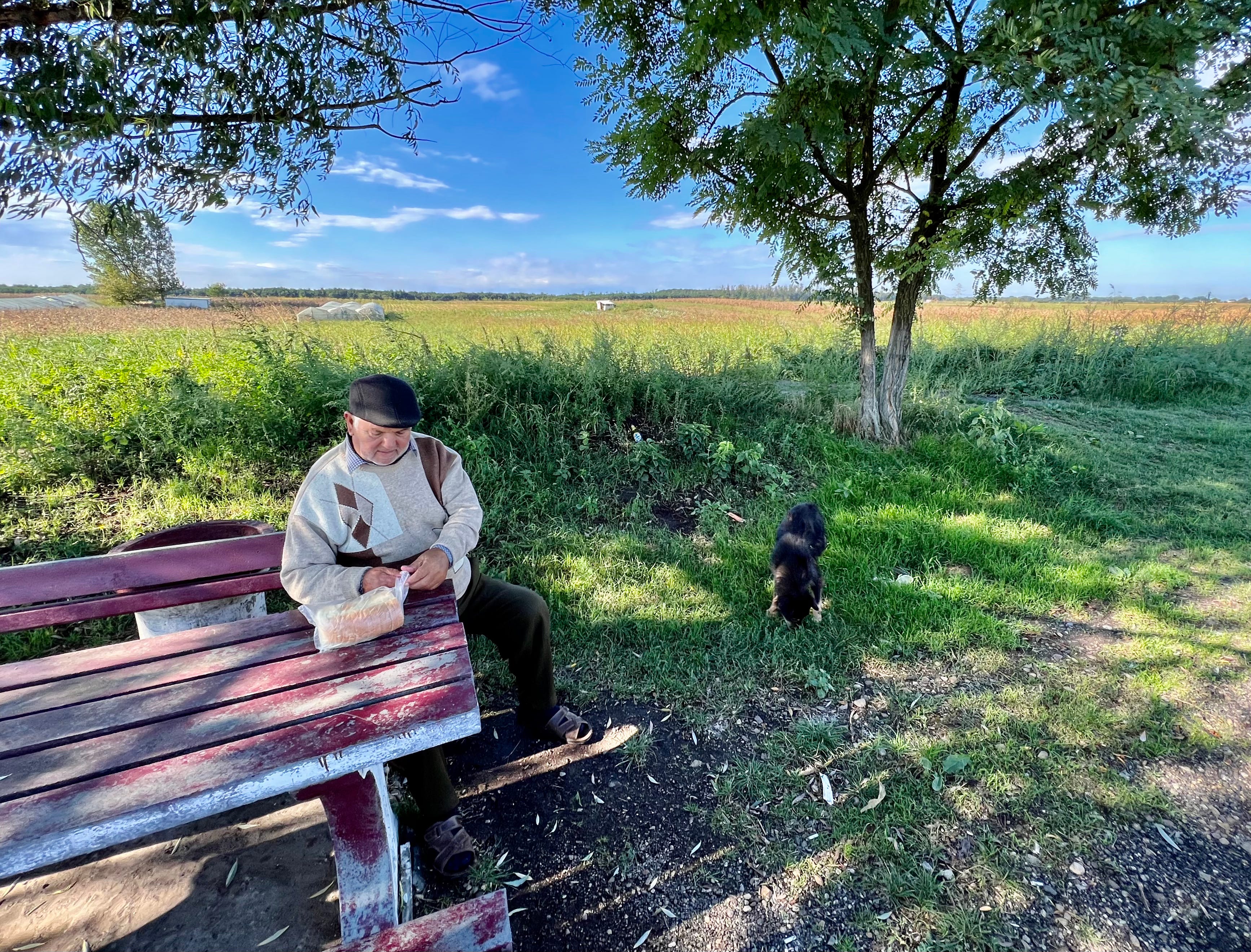 不远处的田野上有座白色窝棚,老大爷冲窝棚打了几个呼哨,一条黑狗出现在窝棚口,向我们张望了一会儿,然后奔跑过来。三轮车后斗里放着几袋面包,老大爷打开一袋喂那条黑狗。他不讲英文,我们用肢体语言做简单的交流。见我手里面包不多了,老大爷要送我一袋面包。我说“贝切特”,指指自己的嘴,表示骑到贝彻特村吃午饭。老大爷纠正我说是“贝凯特”,然后说了几句罗马尼亚语。
