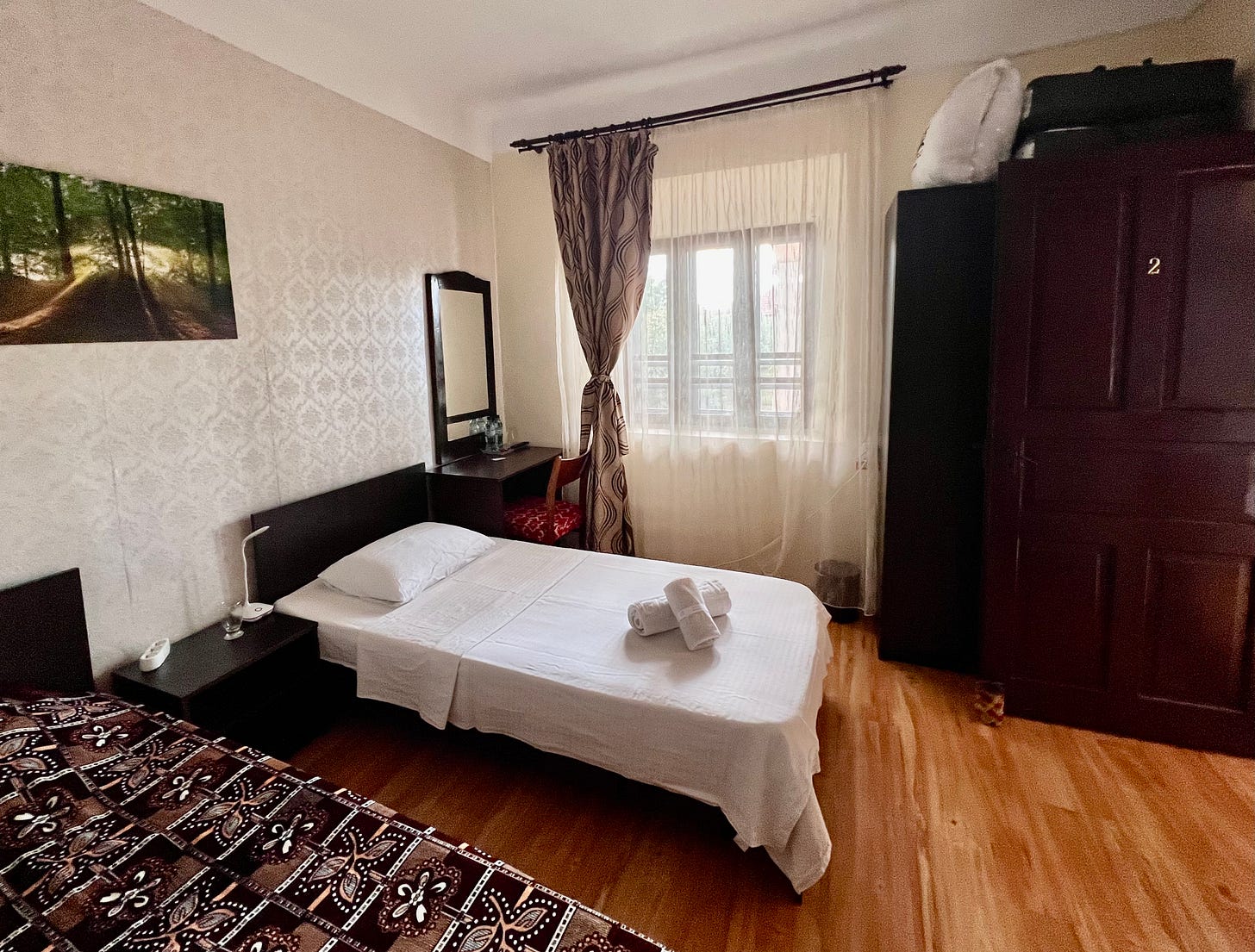 城内的街道布局类似于中国的城市,主街道十分宽阔,中间是凸起的隔离带,两边是整齐高大的水泥柱路灯。那晚住的旅馆位于闹市区,设施比较陈旧,空调看上去至少有20年历史,但床铺和地面都很洁净。楼下有超市、银行、餐馆和各种商铺。街上车来车往,但没有专门的停车场,汽车都停在外侧的车道上。